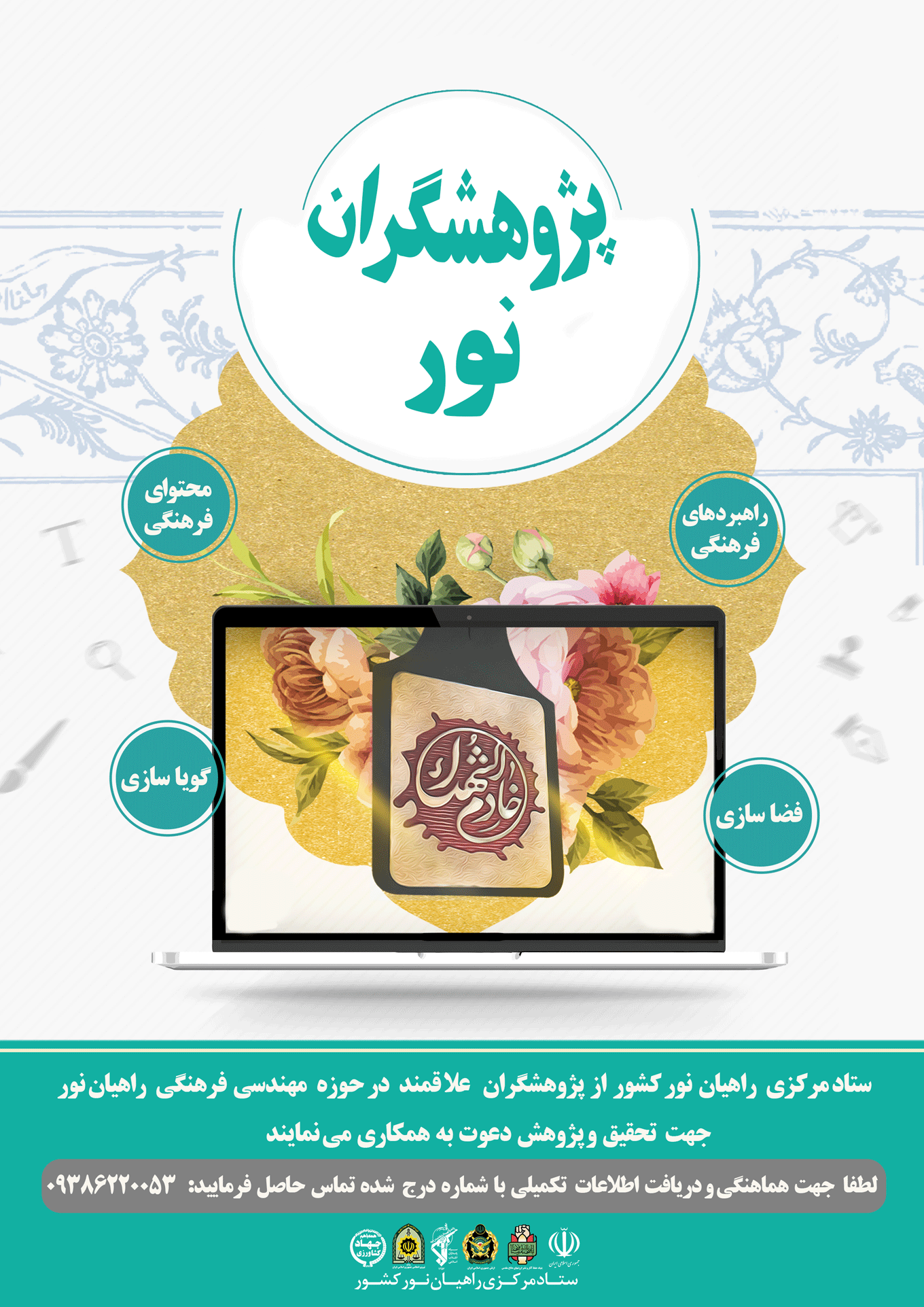 معاونت فرهنگی هنری ستاد مرکزی راهیان نور کشور از پژوهشگران علاقمند در حوزه مهندسی فرهنگی راهیان نور با موضوعات راهبردهای فرهنگی، محتوای فرهنگی، فضاسازی و گویاسازی، جهت تحقیق و پژوهش دعوت به همکاری می نماید.